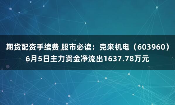 6月5日,克来机电的资金流向显示,主力资金净流出1637.78万元;游资资金净流入108.41万元;散户资金净流入1529.38万元。